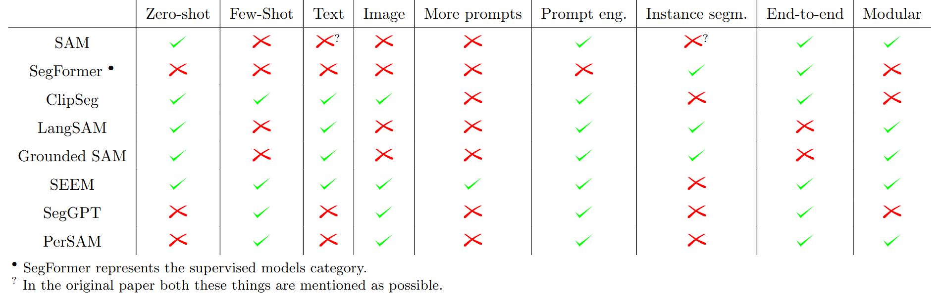 To facilitate the comparison of the models, we have prepared a table highlighting the differences between the presented methods. Each method is compared against the base Segment Anything Model (SAM), with each row representing a separate method and the columns representing the different capabilities of the models: