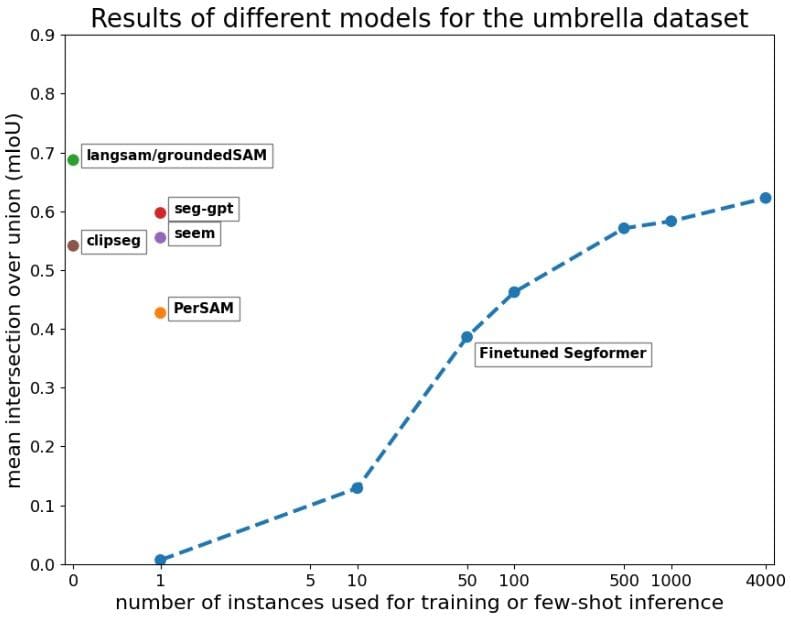 We also performed quantitative comparison using the task of umbrella segmentation, with the goal of determining the amount of training data required for the supervised model to achieve comparable accuracy to the zero-shot and few-shot learners. To evaluate the performance, we utilized the mean intersection over union (mIoU) metric, which is commonly used in image segmentation tasks. The mIoU metric quantifies the overlap between the model’s predictions and the ground truth labels. A value of 1 indicates perfect overlap, representing an excellent model, while a value of 0 indicates no overlap, indicating poor model performance.