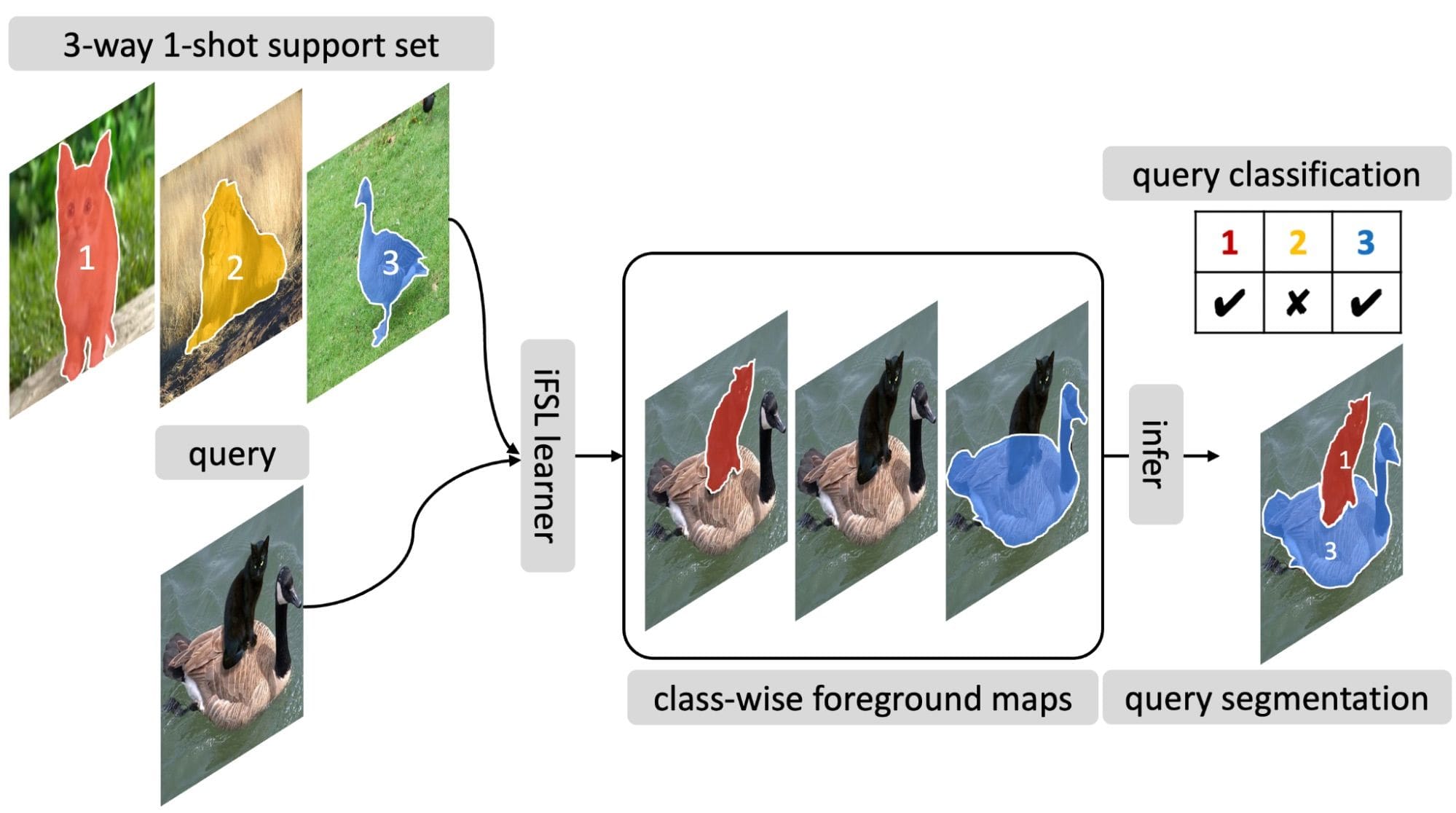 In this scenario, when training a network with a large dataset, the objective is not simply to learn classification but rather to learn how to associate similarities and differences between objects. Few-shot learning is a bit simpler than zero-shot learning, but it still poses significant challenges. In the context of image segmentation, few-shot learning may be represented as follows:
