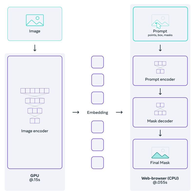 To achieve this, SAM utilizes two encoders: one for encoding the image and another for encoding the prompt. The embeddings from both encoders are then connected and passed through the segmentation decoder to generate the segmented output. This modular approach allows the exchange or fine-tuning of all three models separately. Additionally, SAM brings computational efficiency through the reuse of embeddings. Once the embedding for a given image is calculated, it can be reused for every inference on that image. Only new prompt embeddings need to be computed, resulting in a faster overall process.