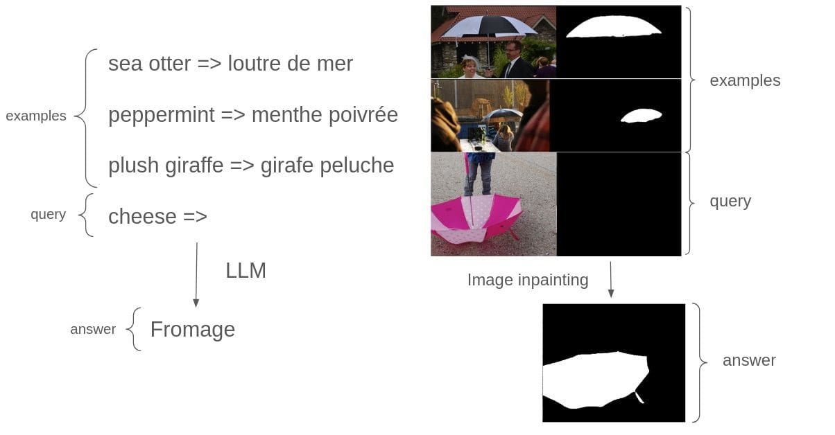 While training such a model is a complex topic on its own, using it for inference is relatively straightforward. First, we provide at least one example of how the task should be solved, consisting of an input image and its corresponding expected image mask. Then, we prompt the model with an input image and an empty image, and the model is expected to inpaint a mask on the empty image based on the previously shown examples.