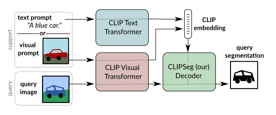 CLIP was created to combine knowledge of language concepts with semantic knowledge of images via embeddings. It soon became a vital part of models such as DALL·E 2 or Stable Diffusion. The fact that researchers tried to utilize it for image segmentation is nothing special; this is how ClipSeg emerged. This method can work in both zero- and one-shot scenarios, taking both image and/or text as a prompt. During inference, it calculates embeddings of the prompt utilizing a CLIP encoder and passes it to a transformer-based segmentation decoder. The biggest advantage of this method lies in its simplicity – it doesn’t parse prompts in a complicated way; it is end-to-end; and its backbone is a very well-known model.