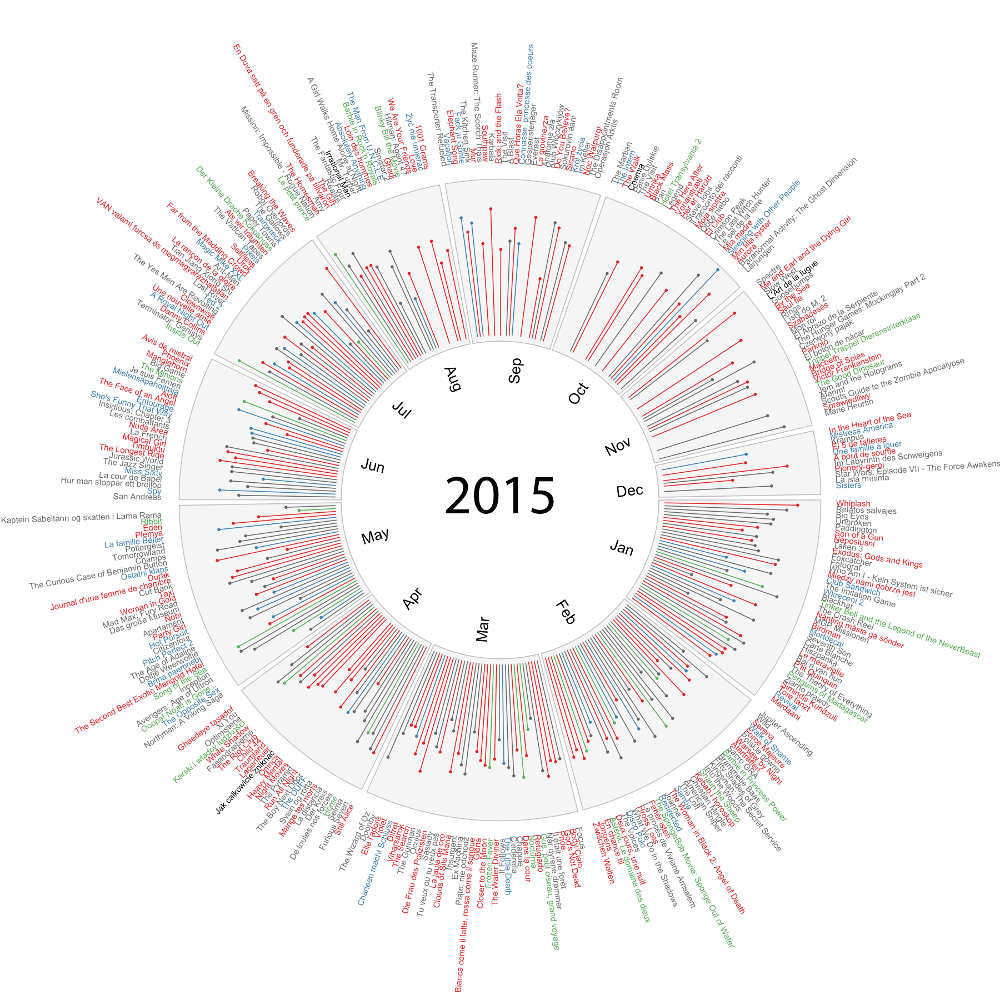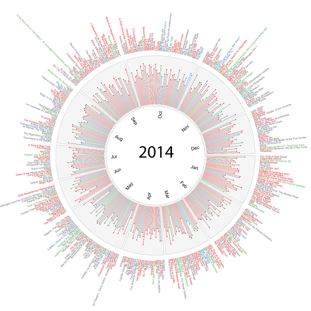 In order to test the possibilities of that library I downloaded data on premieres of movies that took place in 2014 and 2015 from the FilmWeb website. I presented these premieres on a circle assigning different colours to movies representing various genres and giving information on the average rating.
