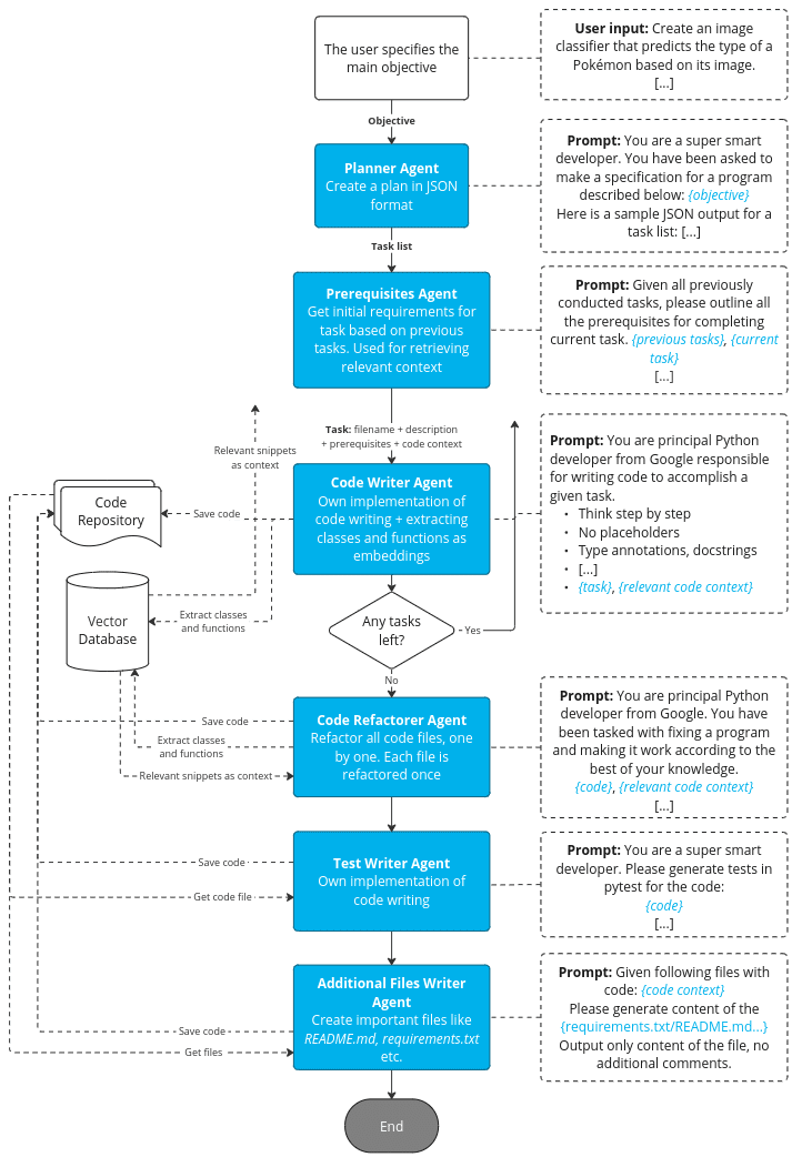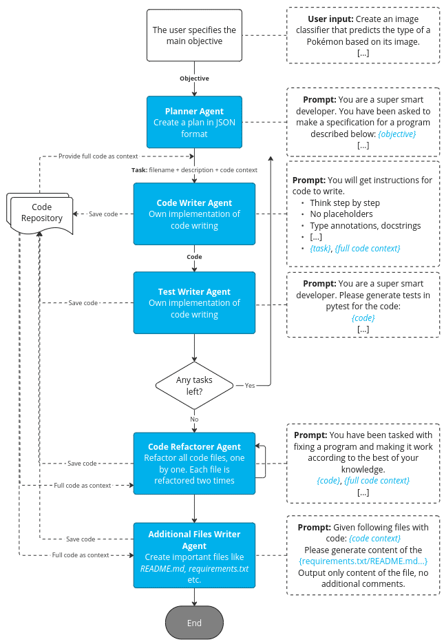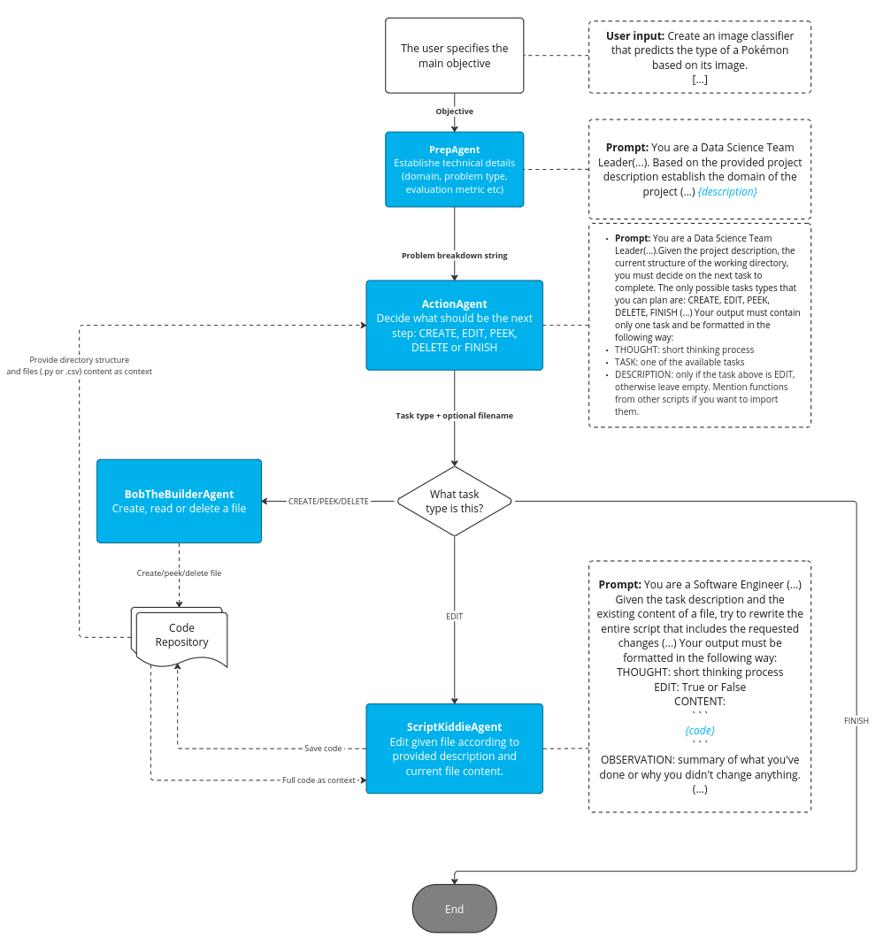 - CodeRefactorer – responsible for refactoring previously written code and tests (we thought it was a good idea based on how human Software Engineers and Data Scientists usually work – by implementing a rough version first and refactoring it later.)