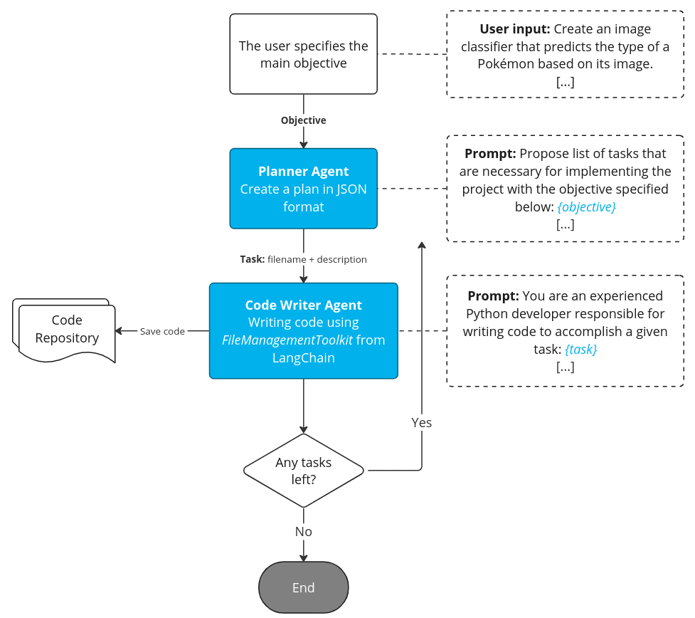 - Code Generation: Finally, we iterate through the plan, where the CodeWriter agent generates and stores the code into files – we use FileManagementToolkit from LangChain for that purpose, as it allows you to read, create and modify files (learn more here).