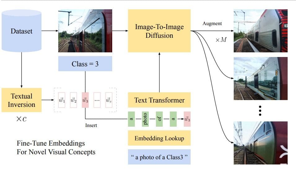The authors utilize pre-trained diffusion models to generate high-quality augmentations for images, even those with visual concepts not previously known to the base model. In the text-encoder, new tokens were used to adapt the diffusion model to new domains. In order to do so, Textural Inversion [6] was applied – a technique for capturing novel concepts in the embedding space of a text encoder.