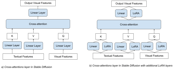 LoRA achieves this by incorporating additional linear layers into the cross-attention layer. Fig. 5 provides a schematic representation of how it works. In the Stable Diffusion model, the cross-attention layers play a vital role in image generation as they facilitate the interaction between the processed textual prompt and the generated image. During fine-tuning, only the additional layers, which use significantly fewer weights compared to the entire model, are trained. As a result, the training process is quick, and powerful computing resources are not required.