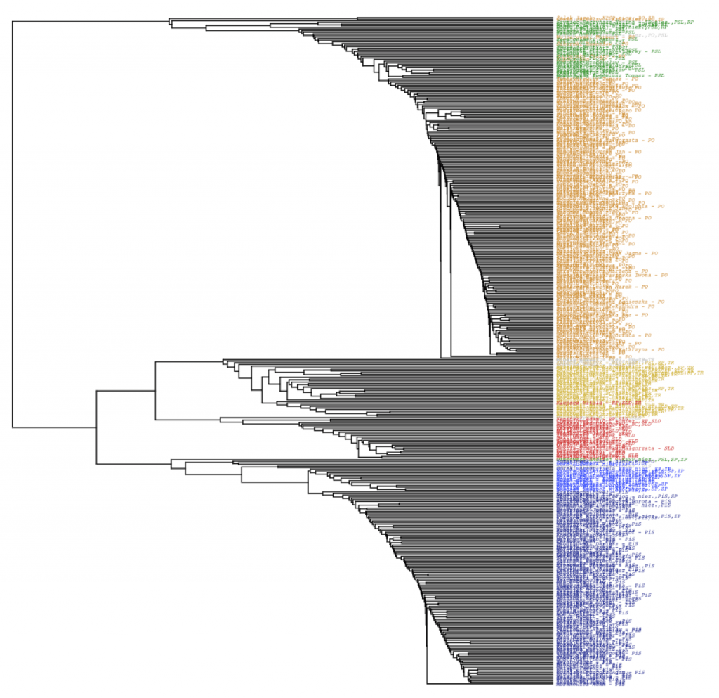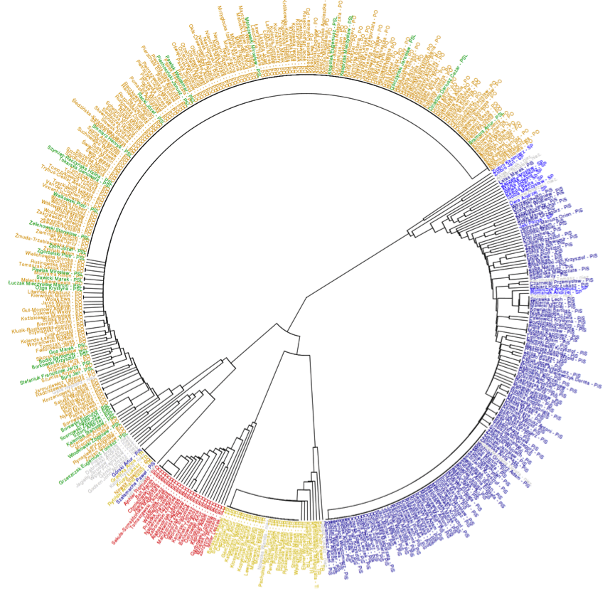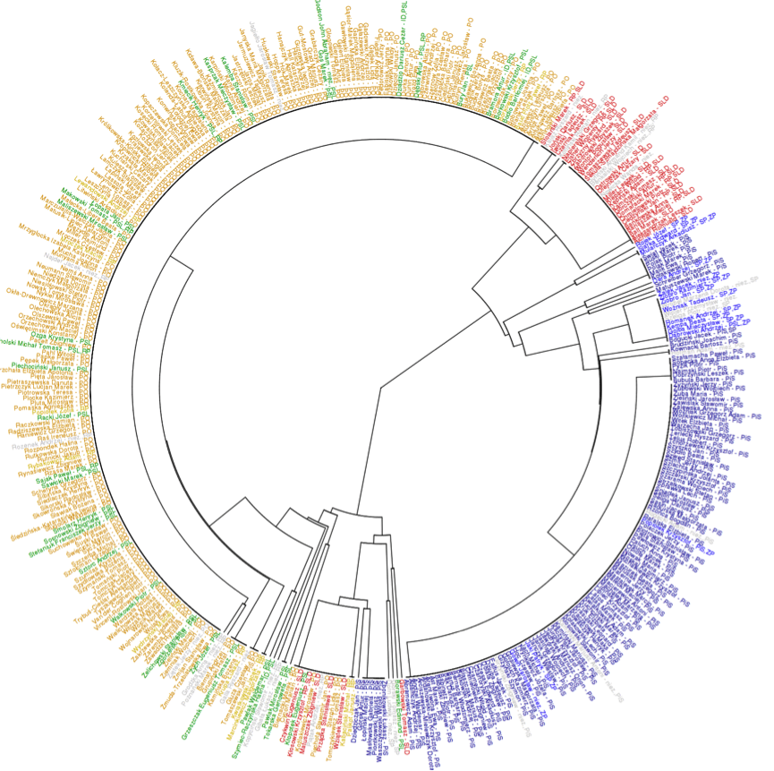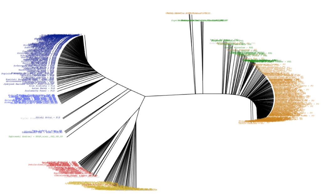 We may also present the whole tree, although it has many leaves. When we include the MPs who left the Sejm and were elected for the Sejm, we have over 500 names. As we may see, the Members of Parliament from PO in most cases voted similarly. They create a separate subtree with PSL. PiS with a part of the right wing also creates its own subtree. The remaining two subtrees represent SLD and Twoj Ruch/Ruch Palikota.