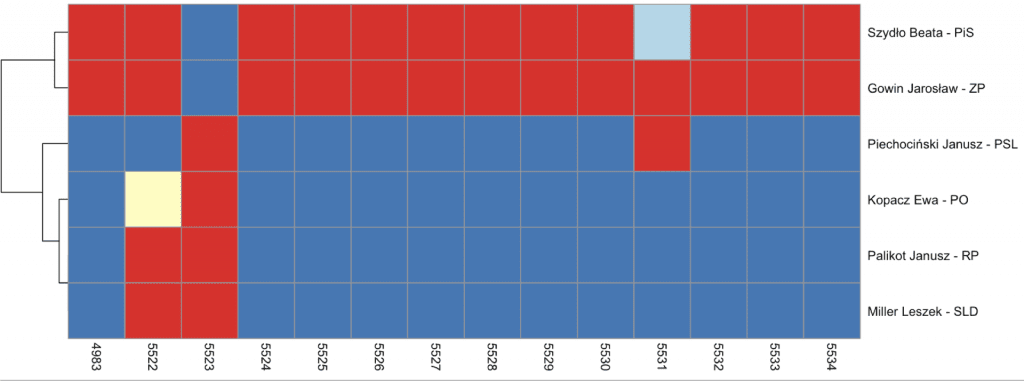 Phylogenetic trees are based on similarities between objects presented on these trees. In this case we will compare levels of similarity between votes cast by the Members of Parliament. Firstly, we will learn about the manner in which that similarity is calculated. As an example let us take six Members of Parliament and a dozen or so votings (here we will discuss 14 votings concerning the Act on Infertility Treatment). Each Member of Parliament might choose between the following options: to vote For, Against, and Abstain from voting (what is a ‘delicate’ against), or simply be absent during the voting. Let us encode these options with numbers: +2, -2, -1 and 0 respectively, or with colours: blue, red, yellow and light blue. The following graphic presents the votes of each of the six Members of Parliament during each of the votings under analysis. The left part of the diagram shows the similarity between the votes. During these votings J. Palikot and L. Miller voted in the same manner; E. Kopacz voted similarly; J. Piechocinski voted in less similar but still fairly alike way. Other two Members of Parliament, B. Szydlo and J. Gowin voted in a similar way but quite differently from the remaining four. The distance between the tree branches corresponds to the voting profiles.