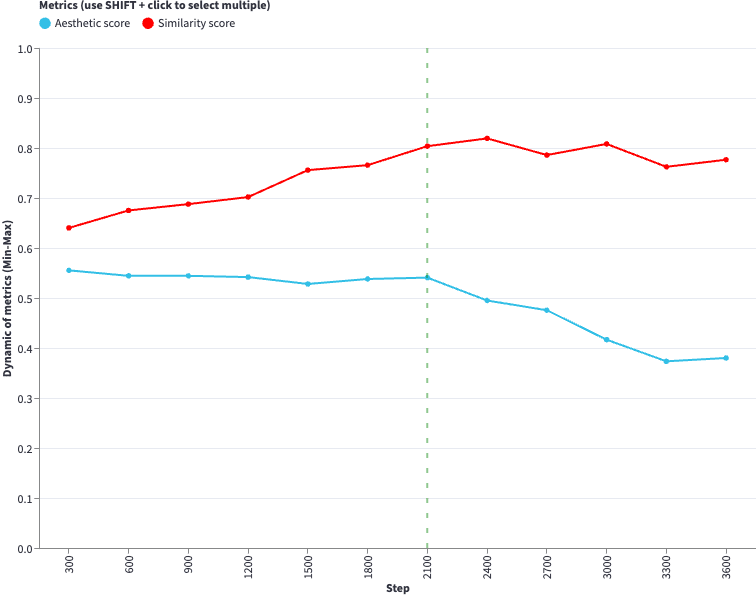 The graph above should help you find the answer to that question. It is fully interactive, so feel free to explore it. We fine-tuned the Stable Diffusion v1.5 model on pictures of several people, and tested a different number of input images to see how it affects the training of the model. You can trace how different metrics behave during the evaluation every 300 steps and how it affects the images produced.