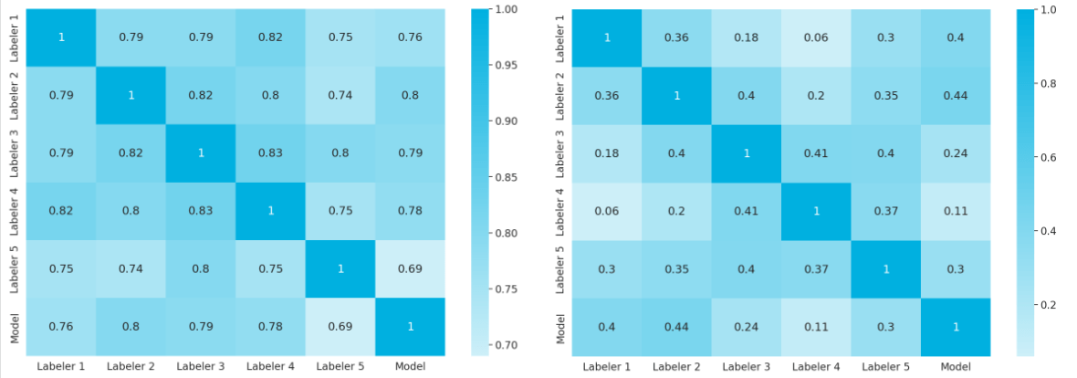 Specifically for the single evaluator grading, we include a modification of the above score established for each labeler. Let’s denote