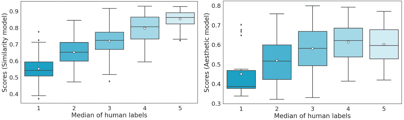 It is worth noting that the LAION dataset [12] on which Stable Diffusion was trained also has aesthetic evaluations. While it might have been easier to use that one, it could lead to unwanted data leakage, which is why we depended on an external dataset.