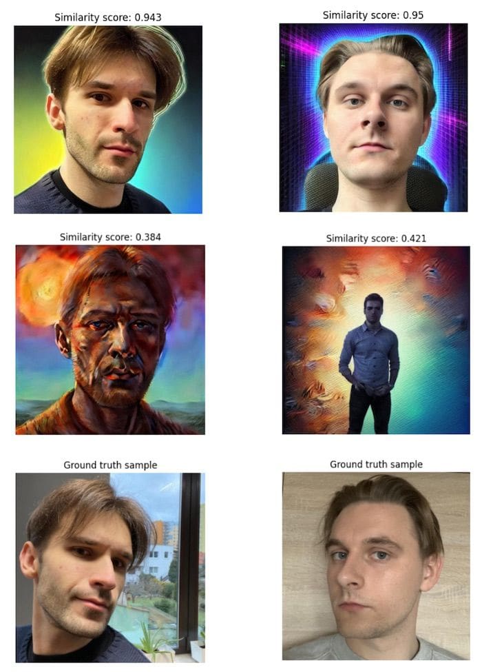 Several natural metrics immediately come to mind, one of which makes it possible to establish how similar the output of our model is to the object that we embedded in the model domain during fine-tuning. Another can inform the user about the aesthetic value of the image. So how can we actually measure those? We decided to use the human-like approach i.e. look at the input/output images and estimate the performance of the model using subjective criteria. The metrics described below were proposed and validated based on one specific type of object: faces.
