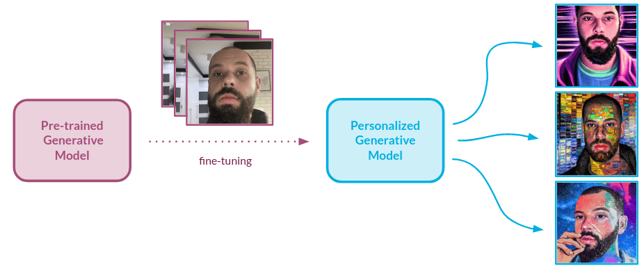 For validation purposes, we used images of 8 different people – 4 women and 4 men – to fine-tune 8 new v1.5 Stable Diffusion models. We used the same number of images to fine-tune the models for all of the subjects. After training, two evaluation datasets were created by generating 128 pictures with each model, using half of the images for similarity validation and the other half for aesthetic validation.