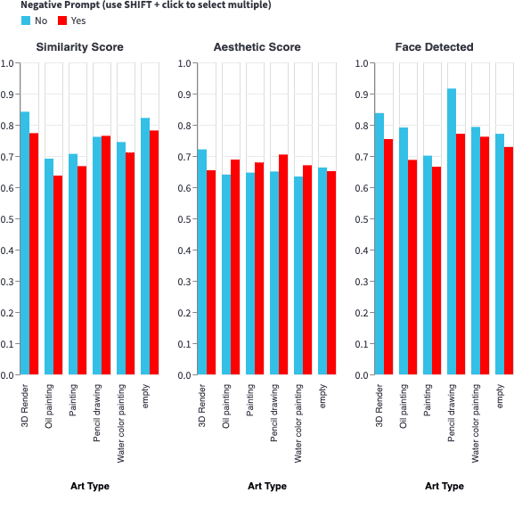 https://diffusion-charts.deepsense.ai/post03_chart007Caption: Overall average results of metrics for the use of negative prompts. Yes – when the negative was used, and No – when it was not.