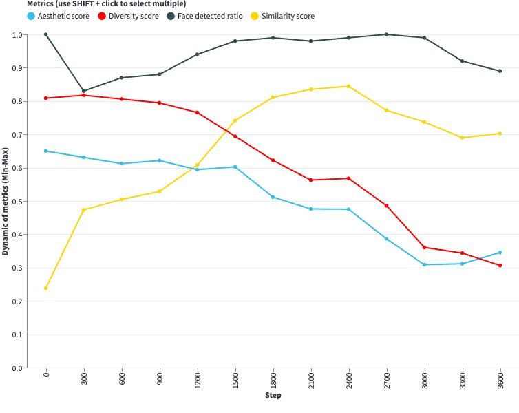 If the metrics can signal the breaking point in training, it may be a good sign that it’s time to stop. Since we monitor multiple competing performance dimensions (metrics), different tradeoffs between similarity, aesthetics, and diversity are possible. To accommodate this, we provided weights for each metric. You can use it to adjust the optimal/stop points to your preferences (we used our preferred weights as a starting point).