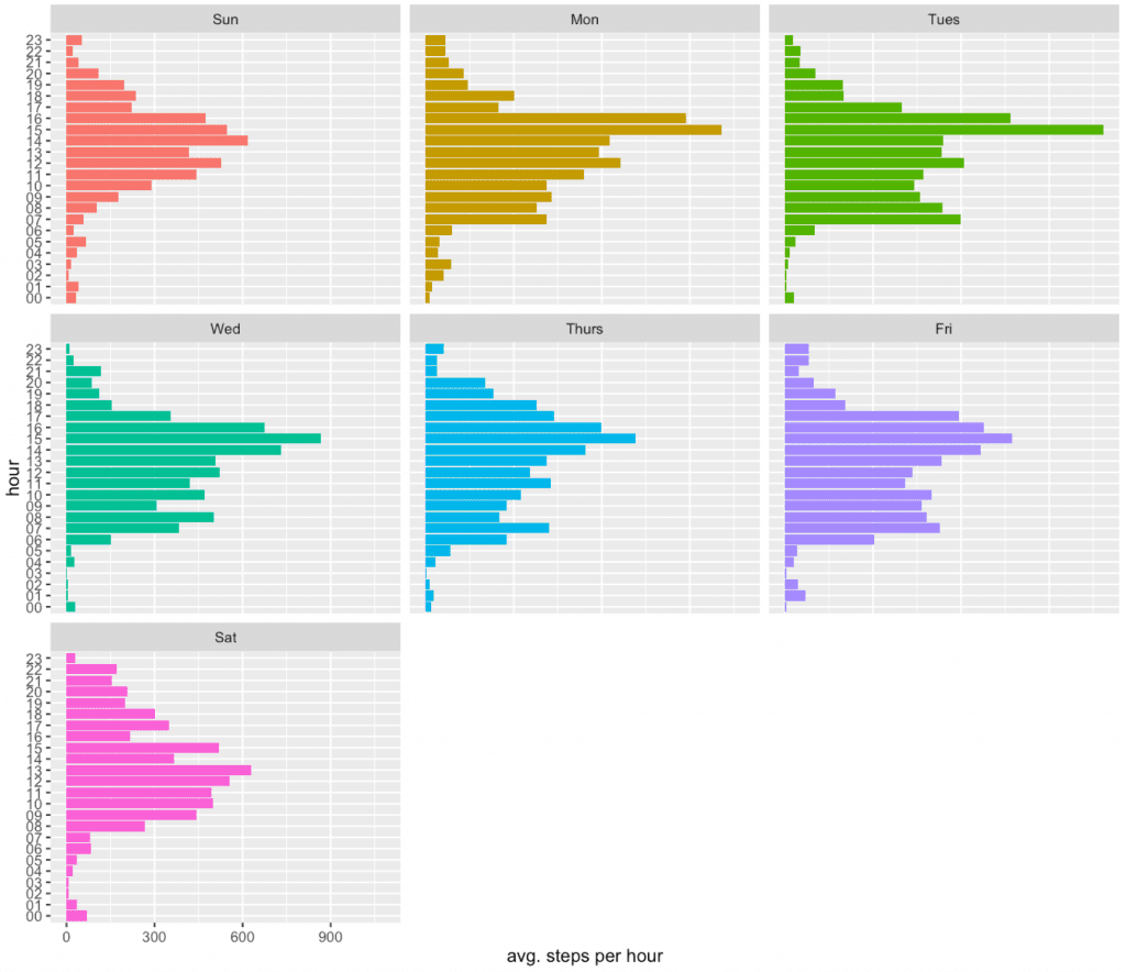 To plot the activity we need to do some aggregation. Here we will count number of steps per hour per day of a week.