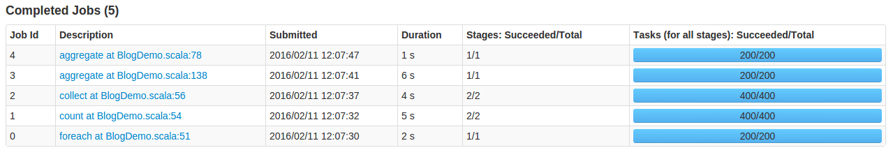 An interesting observation is that the functional job 3 is slower than the reduceByKey job even though it has only 200 tasks. A memory allocation overhead is that severe!