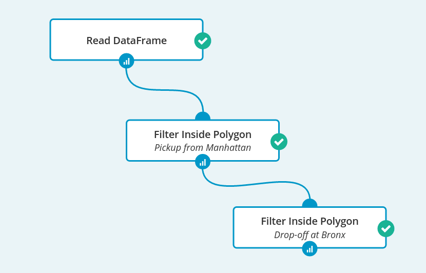 Let’s say that we want to know how many Taxi Trips started on Manhattan and ended up in Bronx. To achieve this, we could use an operation filtering dataset by location contained inside some geographic region. Let’s call this operation ‘Filter inside Polygon’.