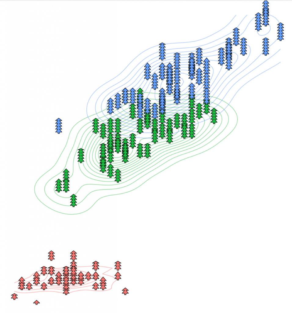 ggplot(iris, aes(x=Sepal.Length, y=Petal.Length, size=Petal.Length, fill=Species)) + stat_density_2d(aes(color=Species)) + geom_christmas_tree() + theme_void() + theme(legend.position="none")