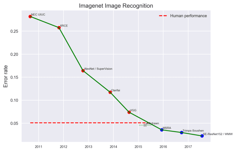 There are few exceptions to this rule, including the whale individuals detection contest our deepsense.ai team won (85% accuracy for almost 500 different whales). However, one could argue that a computer’s pattern recognition skills were similar to a human’s, but it was easier for the computer to memorize 500 different whale specimens.