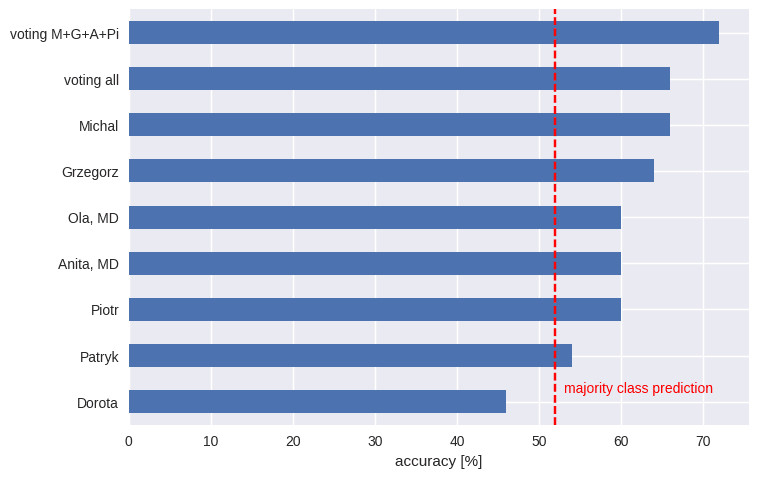 At least most of us did better than using the majority class prediction – i.e. assigning each image to the most numerous class. The medical doctors didn’t outperform the rest of us. That may seem surprising, but there is a common phenomenon at work here: many visual task much knowledge, just good pattern recognition (even pigeons can detect cancer from photos). Even less unexpected is the wisdom of crowds – an ensemble model (which involves members of “the crowd” voting) significantly outperformed each individual prediction.