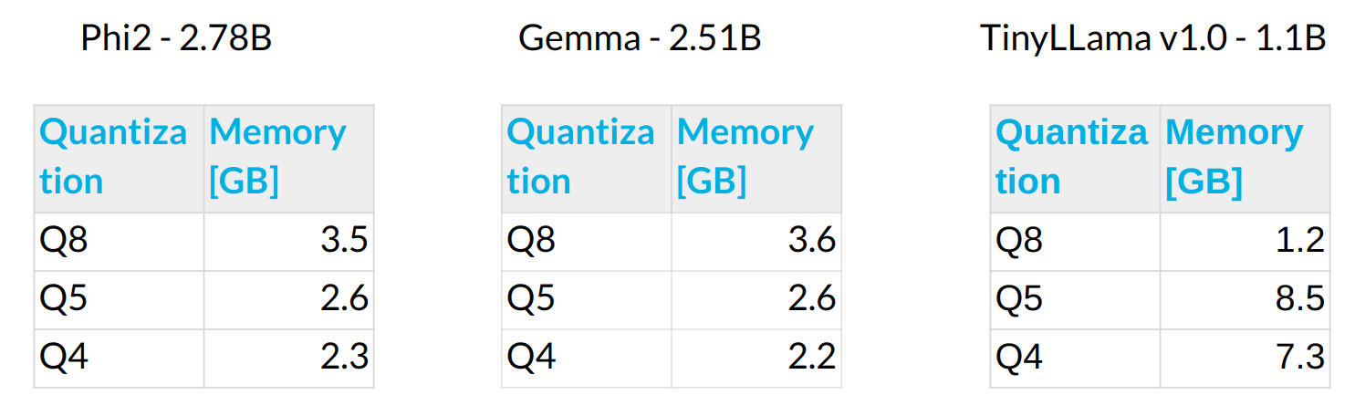 Here, we were evaluating models in the 1-3B range. It is possible to push 7B models with lower quantization levels, but they are slower and require memory that is available only on high-end smartphones. Speaking about the memory, here are the RAM results needed per model and quantization level.