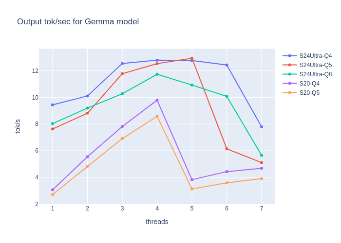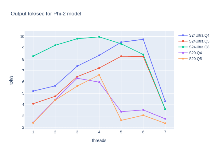 The lower quantization means some weight is stored with less precision. It is a severe reduction with needed RAM. Plots show the generation speed for SLM on two mobile devices: