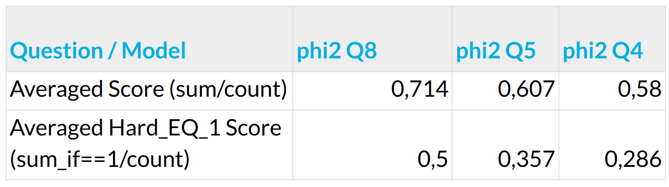 The big issue with phi2 at this stage (for this templated prompt) was, even after correctly responding, producing additional questions and answers (starting with another Question: token) or changing the topic and continuing the monolog. Here, we observed that some of these (change topic) behaviors start from repetitive patterns (like {correct_answer} Output: unrelated content). One idea would be to apply post-processing and cut off these patterns; however, some ways the model goes to the next topic are creative and impossible to catch by a simple pattern matching. Also, a brute-force post-processing like that could harm some correct responses. The other idea would be to work with prompt engineering to better instruct the model for shorter answers and improve quality, which we have tried in the following steps.