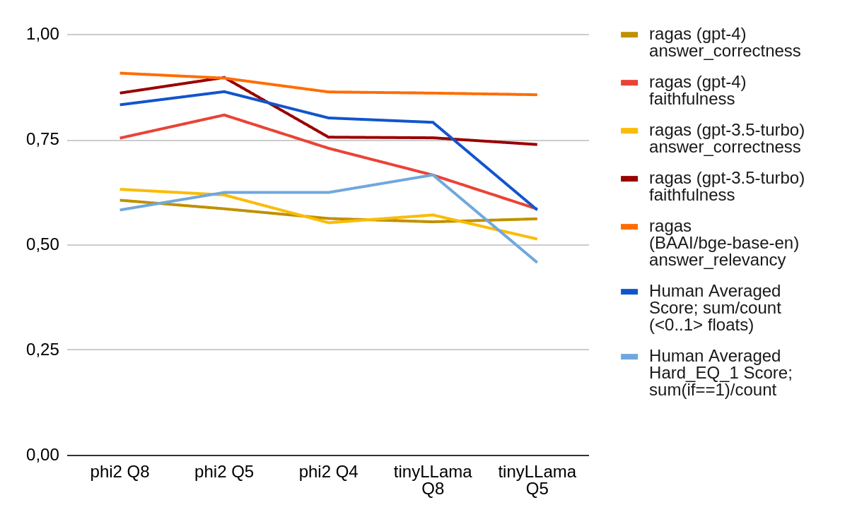 One question was whether we can rely on Ragas’ Evaluation and how it relates to our human scores. This tiny test cannot be treated as a conclusive answer, but using Ragas might help automate evaluation tests. It would be too much to say that Ragas correlates well with human answers (in general), but at least for this small dataset, that looks good. Nevertheless, human checking on top of that (for smaller datasets) should be standard practice. It is worth noting that by keeping the same seed (seed_id for generating the answer with LLM), we can see an increase in the results for less aggressive quantizations on Ragas metrics.