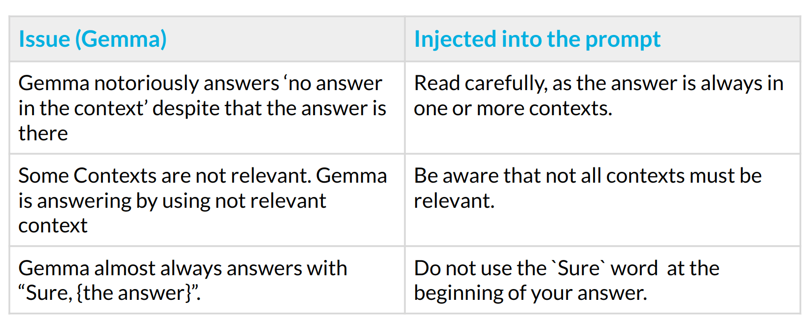 We learned that each model has its problems and needs separate prompt engineering. Here, we show some issues with the Gemma model and how we can address them by modifying the original prompt.