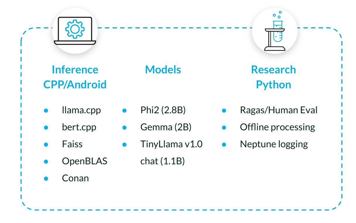 Below, we provide a quick overview of the project, divided into research and inference sites. For the tech stack used in inference, we chose llama.cpp as an inference engine for SLMs, bert.cpp as a framework for embedding a model (now fully integrated into llama.cpp), Faiss as a library for realizing k-nn search for embeddings from user queries and embeddings from document chunks, OpenBLAS as Faiss requires a BLAS implementation, and Conan to manage C++ dependencies in the Android environment. On the research side, we evaluated models using both human and automated metrics (Ragas) and benchmarked the application.