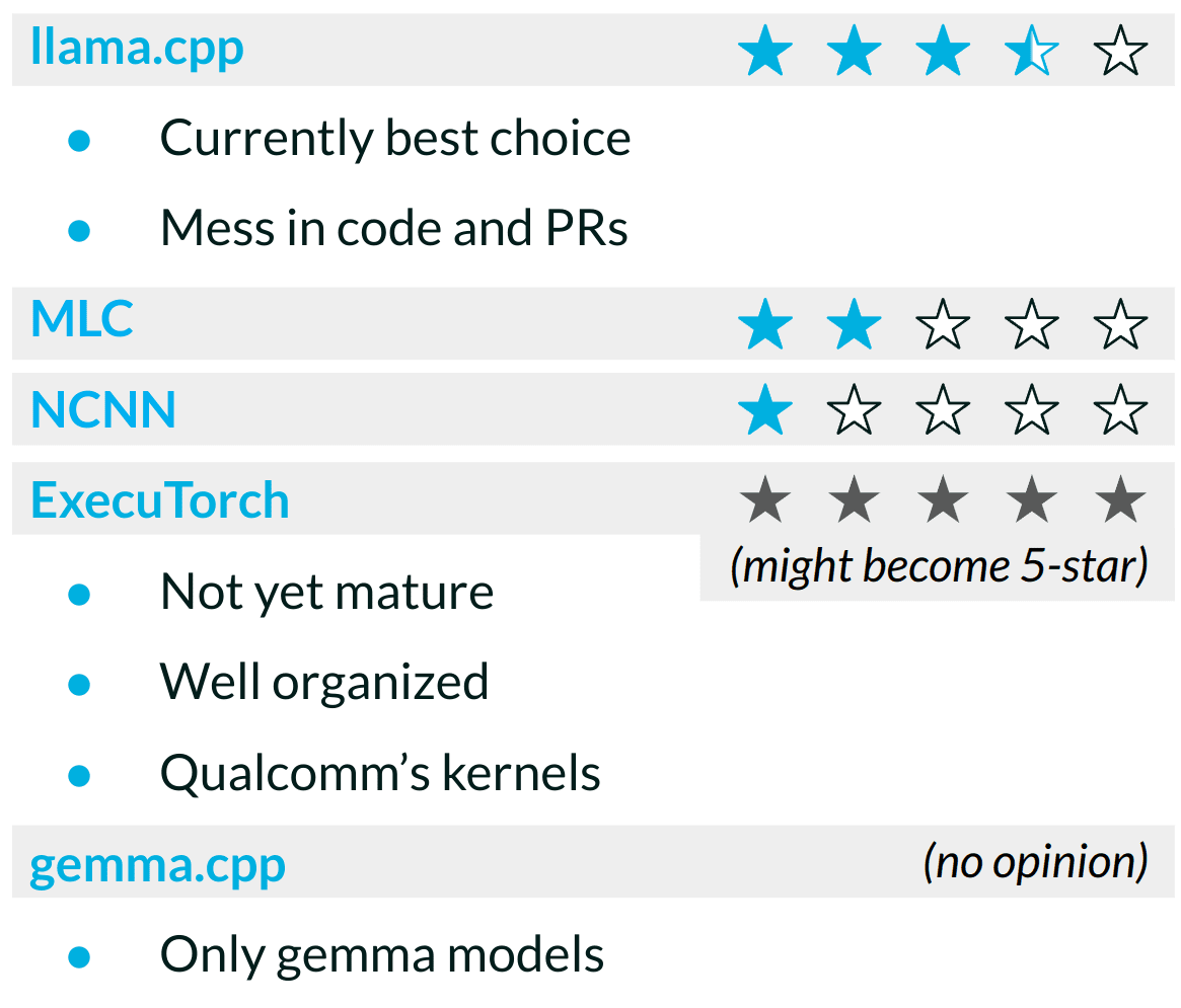 - Executorch is an uprising star. Qualcomm kernels have very impressive runtimes for exemplary ML models like image segmentation. However, as of today, LLM support is poor, and the model is not yet production-ready.