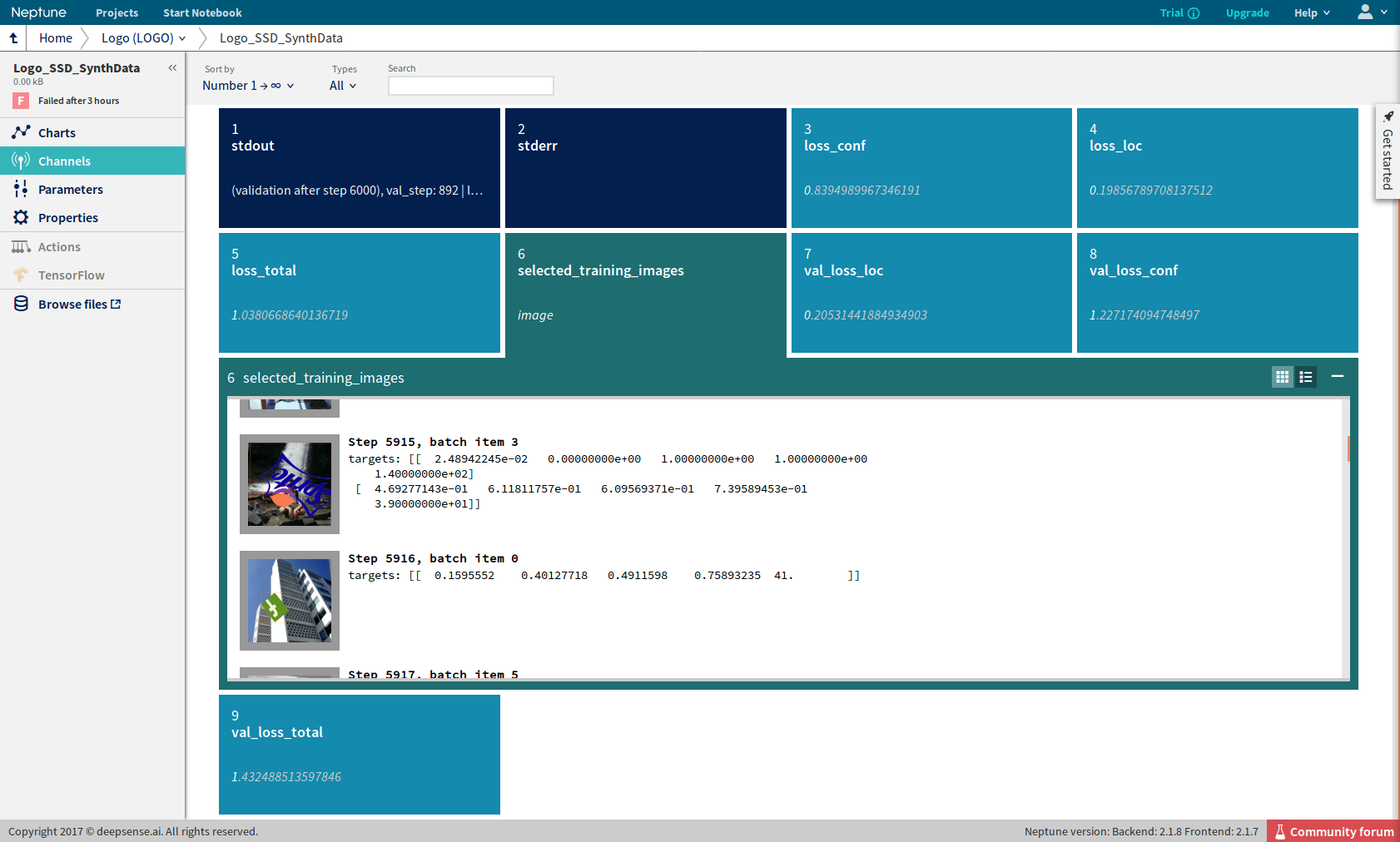 In the process of refining the SSD architecture for our requirements, we ran dozens of experiments. This was an iterative process with a large delay between the start and finish of an experiment (typically 1-2 days). In order to run numerous experiments in parallel, we used Neptune, our machine learning experiment manager. Neptune captures the values of the loss function and other statistics while an experiment is running, displaying them in a friendly web UI. Additionally, it can capture images via image channels and display them, which really helped us troubleshoot the different variations of the data augmentation we tested.
