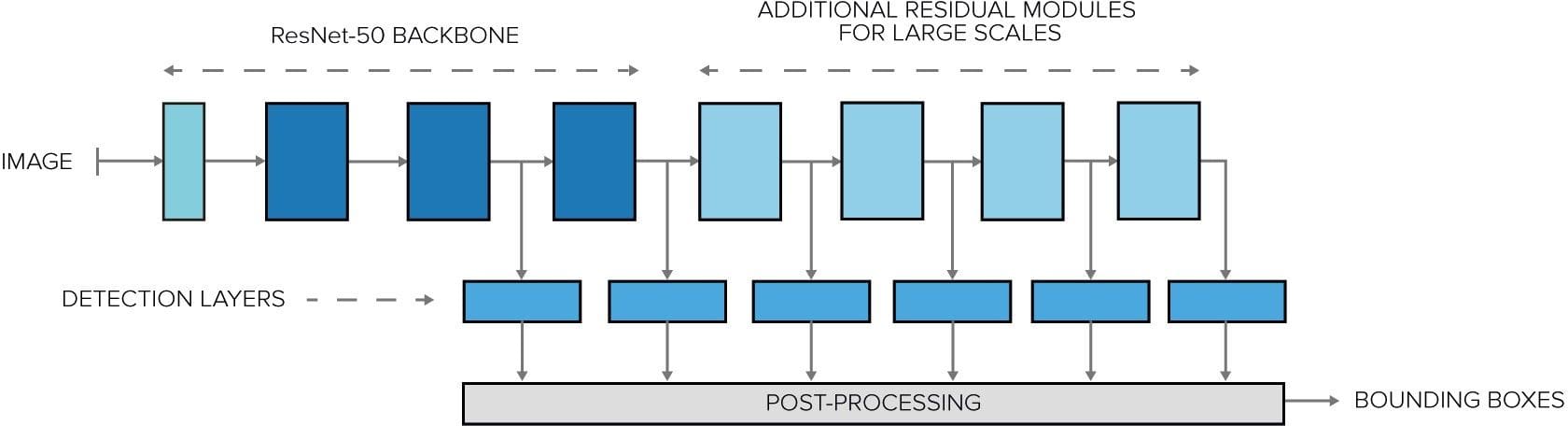 Since real-time video processing is one of the requirements of our system, we decided to go with the SSD method rather than Fast R-CNN. Our network also uses ResNet-50 as its convnet backbone, rather than the default VGG-16. This made it much less memory-hungry, while also helping to stabilize the training process.