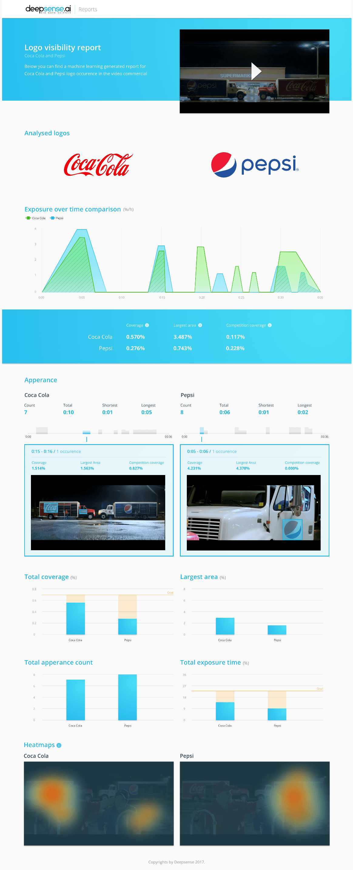 We processed a short video featuring a competition between rivals Coca-Cola and Pepsi to see which brand received more exposure in quantitative terms. You can watch it on YouTube by following this link. Which logo has better visibility? Below, you can compare your guesses with what our model reported: