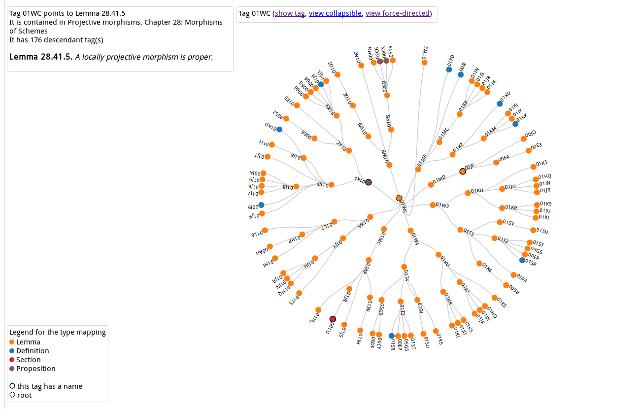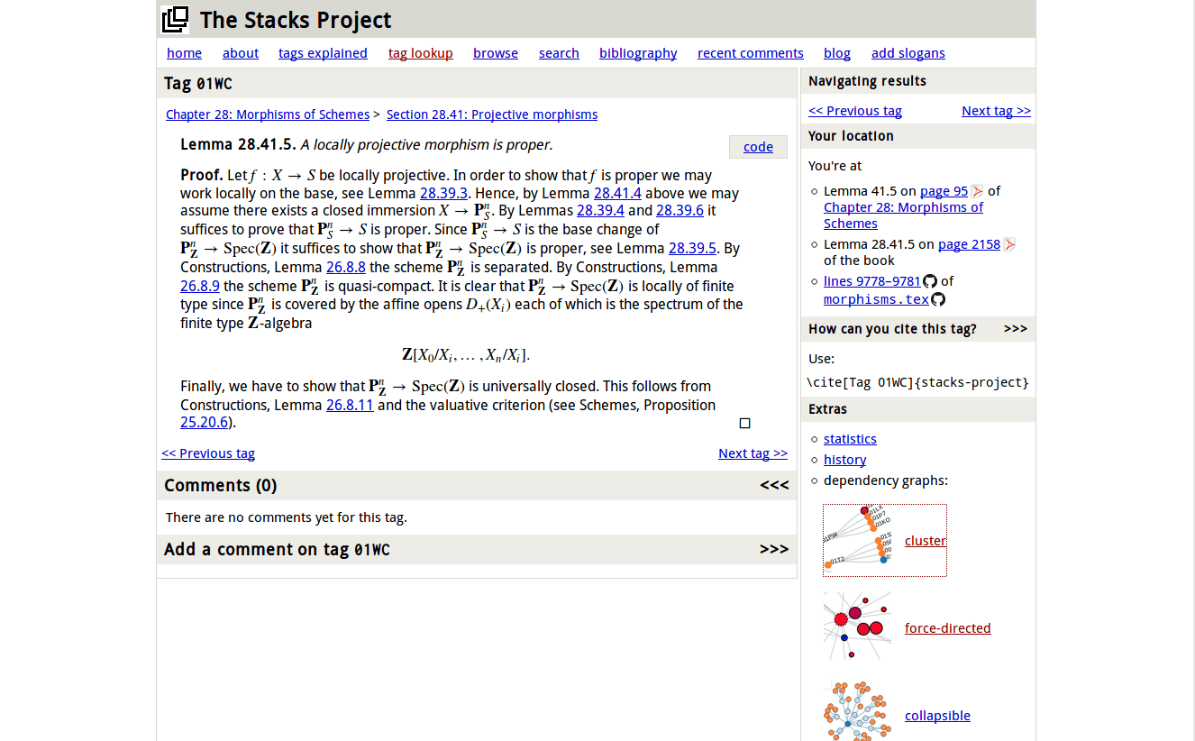 Fig. 2: One of the lemmas in the Stacks Project. Each lemma has a unique tag (here 01WC), which never changes, even though the number of the lemma may change. Each lemma has a proof and we can access its dependency graphs: