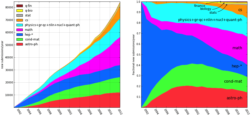 Fig. 1: The graph on the left shows the growing number of submissions to arXiv – an Internet repository for scientific research. In 2012, mathematics accounted for approx. 20,000 submissions annually.