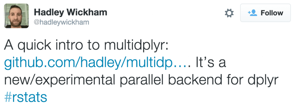 Two days ago Hadley Wickham tweeted a link with introduction to his new package multidplyr. Basically it’s a tool to take advantage of many cores for dplyr operations. Let’s see how to play with it.