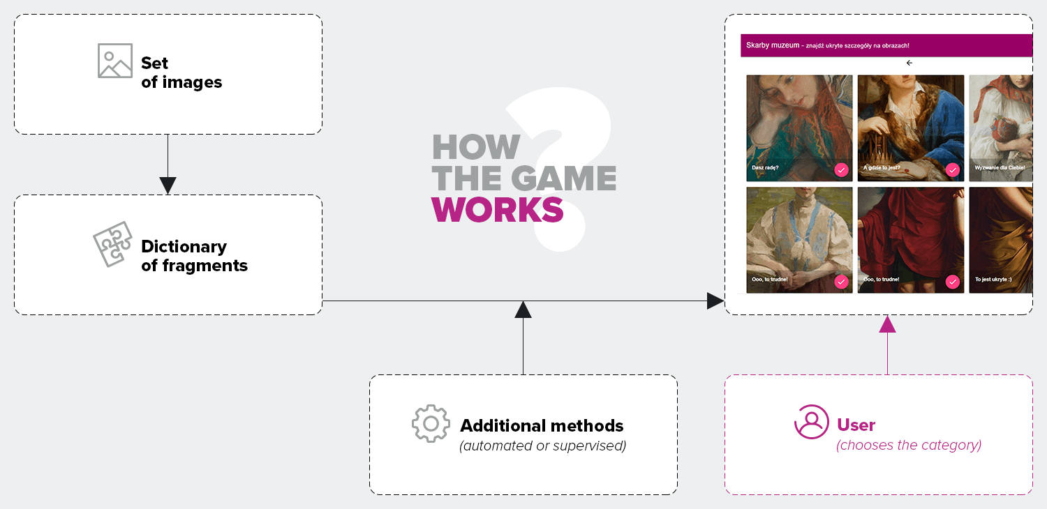 In its basic form, “Museum Treasures” has players look for images, but in further development verification, rewarding and gamification could be added to enrich the experience. Defining the rules of the game, goals and motivation was very important and involved determining the age of the players. The challenges that await a five-year-old will differ from those 12-year-olds will take on. We believed the game could also be interesting for adults, as paths could likewise be created for mature users. We had several ideas for introducing these elements and developing them further. You can read a few of them below.| Verification | |