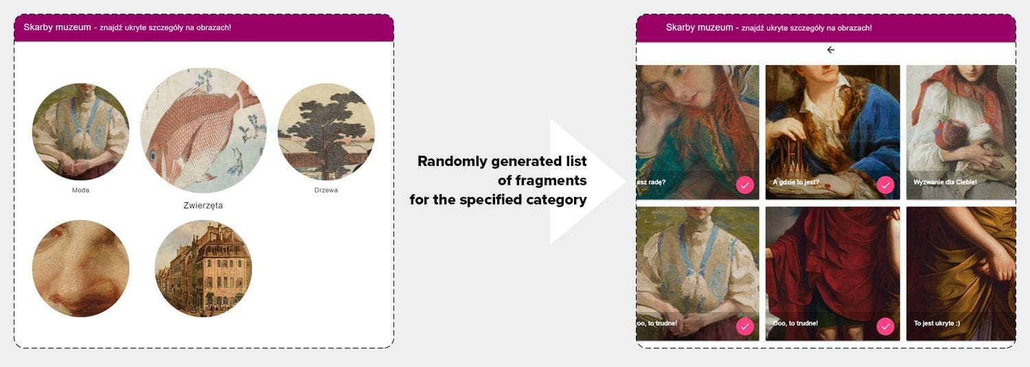 Artificial intelligence allows for the automation of many activities, especially tedious and time-consuming ones. Object recognition in street and satellite photos, diagram analysis, text recognition and analysis – there are countless applications. Now the automatic recognition of what can be found in paintings hanging in a museum can be added to the list. Everyone participating in the hackathon had access to 200 photos of museum pieces. Our solution was to create a database of specific fragments of images – animals, trees, houses, feet, you name it – which could be used to create the various paths of a treasure hunt by category. The database would be extensive, and elements from new exhibitions could be added to it once they were digitalized. The only limitation in selecting the fragments to be used was in this case the set of elements which the object detection model we intended to use could recognize.Image analysis