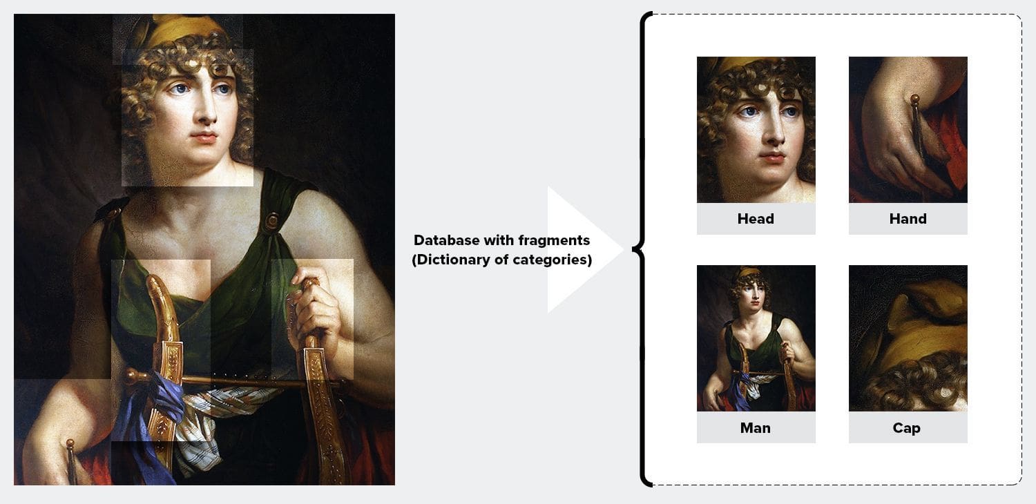 In the image, we will recognize, for example, the head, the hand, the cap and the human, together with the areas where these elements appear (coordinates x, y of the rectangle) and the probability (the certainty with which the model found the element, p). A dictionary of fragments is thus created: