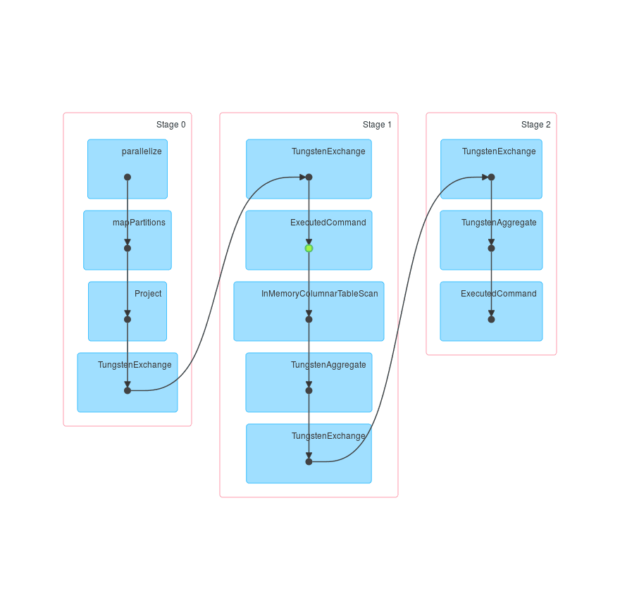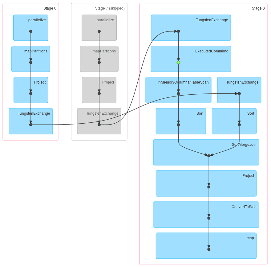 This time the first job has an additional stage – we perform repartitioning by key there. But in both of the following jobs, one stage is skipped and the repartitioned DataFrame is taken from the cache – note that green dot is in a different place now.