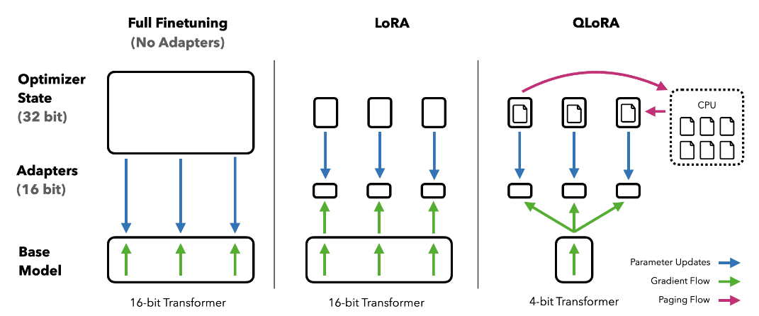 Figure 10. Comparison of full fine-tuning, LoRA and QLoRA, source: https://arxiv.org/pdf/2305.14314.pdf