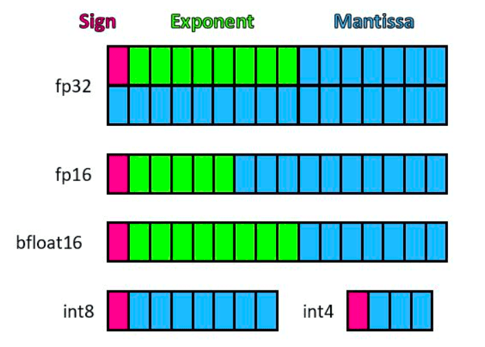 Two common floating-point formats used in deep learning applications include the single-precision floating-point format (known as FP32) and the half-precision floating-point format (FP16). FP32 utilizes 32 bits for representing a floating-point number, distributing 1 bit for the sign, 8 bits for the exponent, and 23 bits for the significand (see Figure 2), whereas FP16 allocates 16 bits, dividing them into 1 bit for the sign, 5 bits for the exponent, and 10 bits for the significand. It is worth mentioning one more data type, designed specifically with deep neural networks in mind – bfloat16 (brain floating point). Numbers in this format are also represented with 16 bits, but composed differently: 1 sign bit, 8 exponent bits (same as FP32), and 7 bits for the significand. In this way, despite bfloat16’s lower numerical precision, its dynamic range is equivalent to that of FP32.
