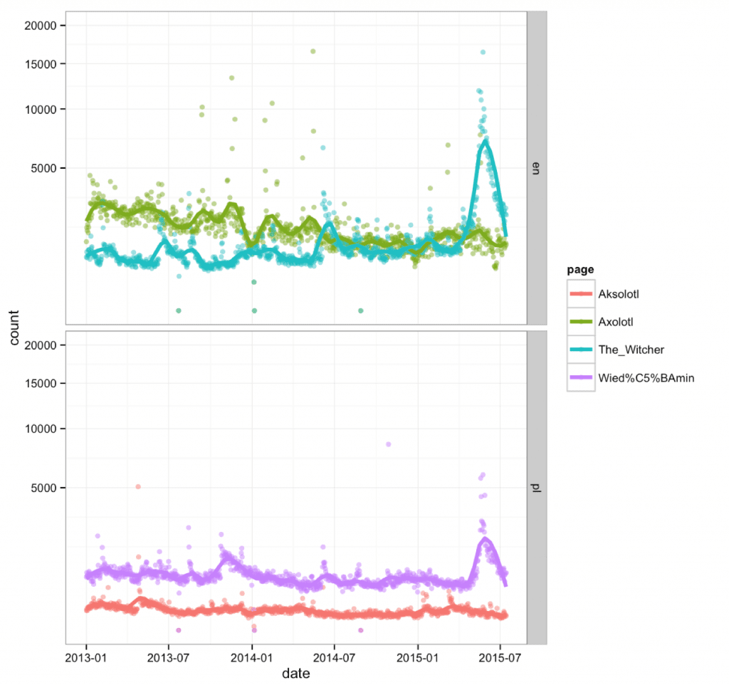 First: download the data. With the function wp_trend it’s enough to set page names (here: The Wither and Axolotl), languages (here: Polish and English) and the time period (let’s see what is happening since the beginning of 2013).