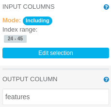 INPUT COLUMNS: Including index range 24-45 (columns generated by the String Indexer, excluding generated column containing edibility label)OUTPUT COLUMN: features