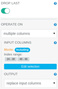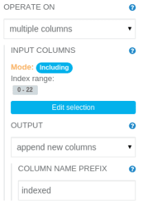 We have to exclude the column at index 39 (indexed_veil-type) because all mushroom specimens had partial veil. One Hot Encoder does not allow operating on columns with only one value (unless user wants to drop the last category using DROP LAST parameter).Assemble Vector operation parameters panelAssemble Vector merges columns with numerics and vectors of numerics into a single vector of numerics. It needs to have its parameters modified, as follows: