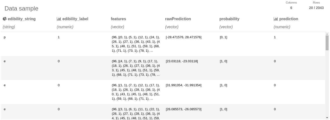 Thanks to projecting only the necessary columns, the resulting dataset fits in the column number limit and we are able to view the data sample. We can notice that the test dataset has 2043 entries. Also we can see that the String Indexer operation assigned 0 to “e” label (edible class) and 1 to “p” label (poisonous class). We can also notice that the prediction column has “almost the same” values as “edibility” column, so we can suspect that our model performs well. Let’s measure its performance: