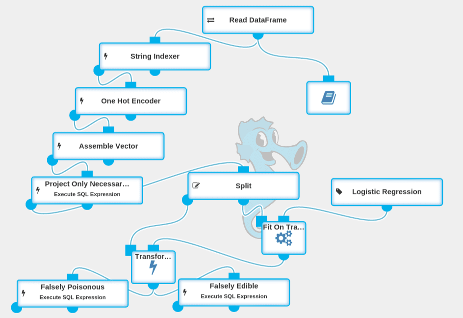 This is a complete experiment that generates a mushroom classification model. It can be downloaded from here, but we will also show you how to create that experiment step-by-step. To follow up with this article and fully understand it, you should download and install Seahorse 1.0 using these instructions.